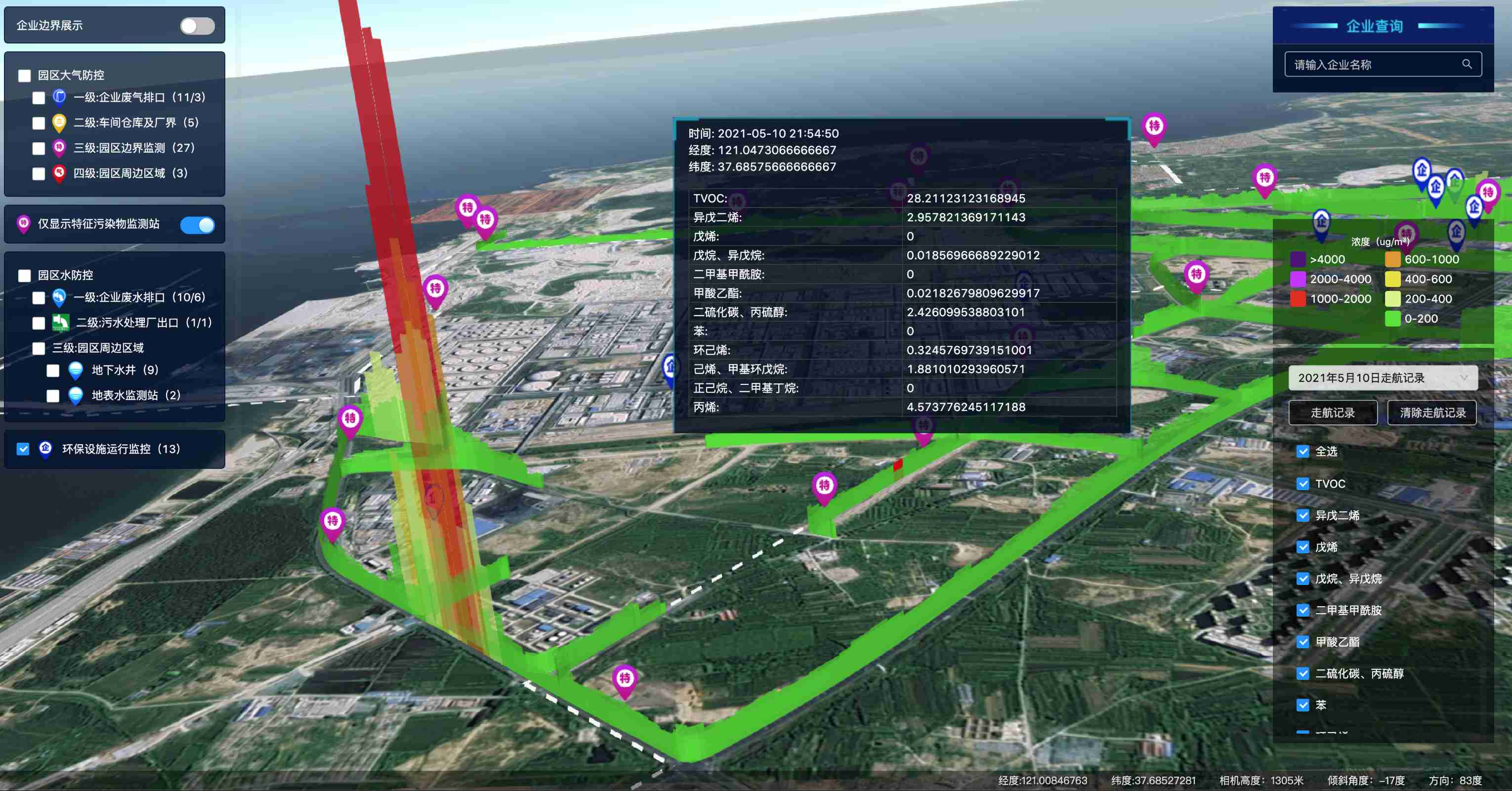 管理系統主要包括大數據中心、能力支撐平臺、數據庫子系統、預警子系統、應急響應子系統、數據分析子系統、信息公開子系統等模塊。通過建立園區三維GIS平臺,整合化工園區和企業危險單元、風險源、監測站點/裝置、應急資源與設施以及周邊環境等的基本信息與分布位置,構建“點、線、面”自動監測網絡,依靠監測網絡數據的實時回傳,將整個園區的日常監測、監控預警、應急聯動等集成到統一的平臺上進行綜合管控,實時監測園區污染物的遷徙路徑,明晰園區各企業特征污染物排放及擴散規律,實現“實時監控、風險預警、數據處理、應急響應、信息發布”等功能。