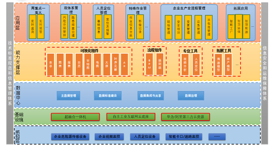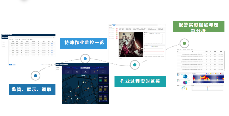 建立以廠區風險四色圖為底層,廠區三維地圖俯視圖為頂層的廠區可視化、立體化全景展示的一張圖,實現基本信息、實時工藝參數、實時儲量以及事故影響范圍的動態變化,建立歷史趨勢、安全態勢評價指數鐳射圖、視頻監控、預警管理、隱患排查記錄等作為浮窗展示;協助公司倒推重點監管危化工藝、重點監管危化品、重大危險源缺失監控和傳感設備,實現“兩重點一重大”的自動化遠程監控,減少現場操作人員;風險分級管控與隱患排查治理系統,嵌入風險辨識、風險判定機理模型,支持整體錄入、線上組織辨識,并根據分析結果形成四色圖展示;將隱患排查治理搬到線上進行,定期上傳隱患排查記錄,線上整改回復,存檔,形成閉環管理,通過排查隱患的數據累積,形成信息化的統計分析,規避風險。 實現特殊作業線上審批,利用視頻監控、4G監控、移動單兵等設施,通過視頻智能分析技術實現作業現場實時監控和分析預警;集成人員定位系統,通過生物智能識別門禁、實時定位技術等,有效識別、跟蹤作業人員及入廠危化品車輛的位置和行為,了解有關人員和危化車輛的位置情況,及時采取相應的救援措施,提高應急救援工作的效率;以安全生產全鏈條一條線,組模建立以安全體系、現場管理、應急管理、承包商管理、培訓管理、變更管理為一體的全流程模式,監管各環節不安全因素、應急事件,有效聯動,做到及發現、及上報、即處理,分類統計分析,全方位分析公司安全管理現狀,提供可持續改進措施。